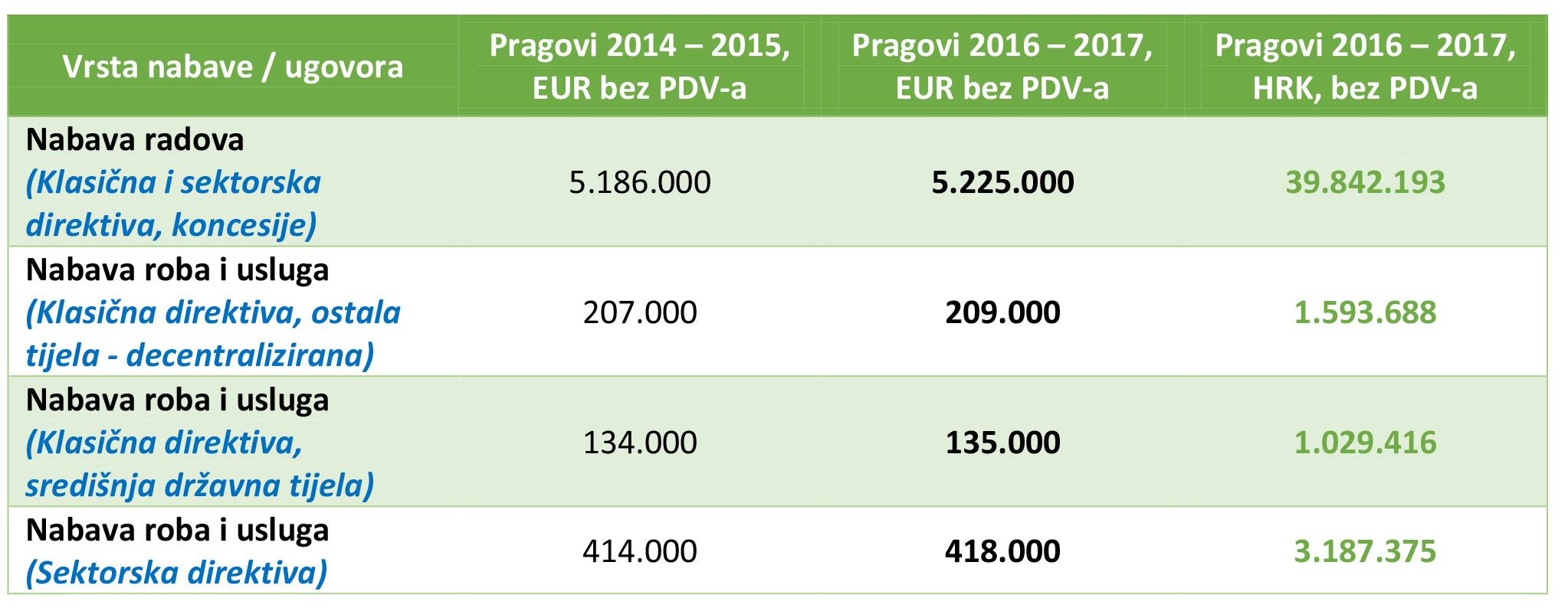 Europska komisija je time objavila vrijednosti novih financijskih pragova, u eurima, za ugovore koji podliježu primjeni propisa o javnoj nabavi u okviru EU i isti se primjenjuju na postupke javne nabave objavljene od 1. siječnja 2016. te ostaju za primjenu naredne dvije godine, odnosno do 31. prosinca 2017.